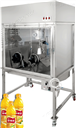 該機(jī)的生產(chǎn)過程如下:瓶子通過練到傳送至三合一灌裝機(jī)。沖瓶機(jī)的回轉(zhuǎn)盤上裝有瓶夾,瓶夾夾住瓶口沿一導(dǎo)軌翻轉(zhuǎn)180°,使瓶口向下進(jìn)入沖瓶機(jī)。在沖瓶機(jī)的特定區(qū)域,特制噴嘴噴出沖瓶水,對(duì)瓶子內(nèi)壁進(jìn)行沖洗。瓶子經(jīng)沖洗、瀝干后在瓶夾夾持下沿導(dǎo)軌再翻轉(zhuǎn)180°,使瓶口向上。洗凈后的瓶子通過撥瓶星輪由沖瓶機(jī)導(dǎo)出并傳送至灌裝機(jī)。進(jìn)入灌裝機(jī)的瓶子由瓶底托板配合撥瓶星輪傳送,通過升降機(jī)機(jī)構(gòu)在凸輪作用下實(shí)現(xiàn)下降下與上升。灌裝采用重力灌裝方式。灌裝結(jié)束后灌裝閥上升離開瓶口閥。瓶子通過卡瓶身過渡撥輪進(jìn)入旋蓋機(jī)。旋蓋機(jī)上的撥輪卡住瓶身保持瓶子直立,瓶底防滑墊防止瓶子旋轉(zhuǎn)。旋蓋頭在旋蓋機(jī)上保持公轉(zhuǎn)并自轉(zhuǎn),在凸輪作用下實(shí)現(xiàn)旋蓋、脫蓋動(dòng)作,完成整個(gè)封蓋的過程。成品瓶通過出瓶撥輪從旋蓋機(jī)傳送到出瓶輸送鏈上,由輸送鏈傳送出三合一瓶裝機(jī)。整機(jī)設(shè)備采用封閉,封窗高度高于設(shè)備zui高點(diǎn),進(jìn)、出瓶處留有適當(dāng)?shù)耐ǖ?,封窗底部留有排風(fēng)槽。