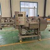 工作前,將干面包屑或雪花片加入儲(chǔ)料倉(cāng)內(nèi),啟動(dòng)輸送網(wǎng)帶,調(diào)節(jié)出粉口流量,要求覆蓋整個(gè)輸送網(wǎng)帶的寬度,以保證產(chǎn)品裹涂均勻。待底粉均勻分布后,即可進(jìn)行產(chǎn)品的裹粉操作。產(chǎn)品由輸送網(wǎng)帶送入撒粉區(qū)裹涂,然后經(jīng)風(fēng)刀吹去多余部分面包屑,就完成了裹糠過(guò)程。