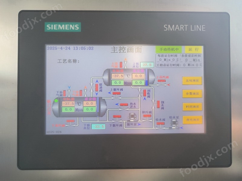 裝料密封:將待殺菌產(chǎn)品裝入內(nèi)層殺菌腔,擺放均勻,關(guān)閉鍋門并鎖緊,確保密封良好。