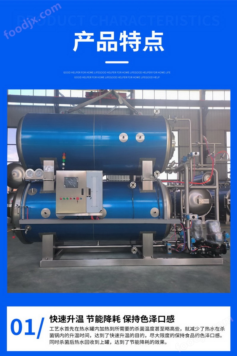 核心結(jié)論:以 “內(nèi)層水浴加熱 + 外層保溫” 為核心,通過熱水循環(huán)實(shí)現(xiàn)均勻升溫殺菌,搭配控溫控壓設(shè)計(jì),保障產(chǎn)品殺菌效果與品質(zhì)穩(wěn)定。