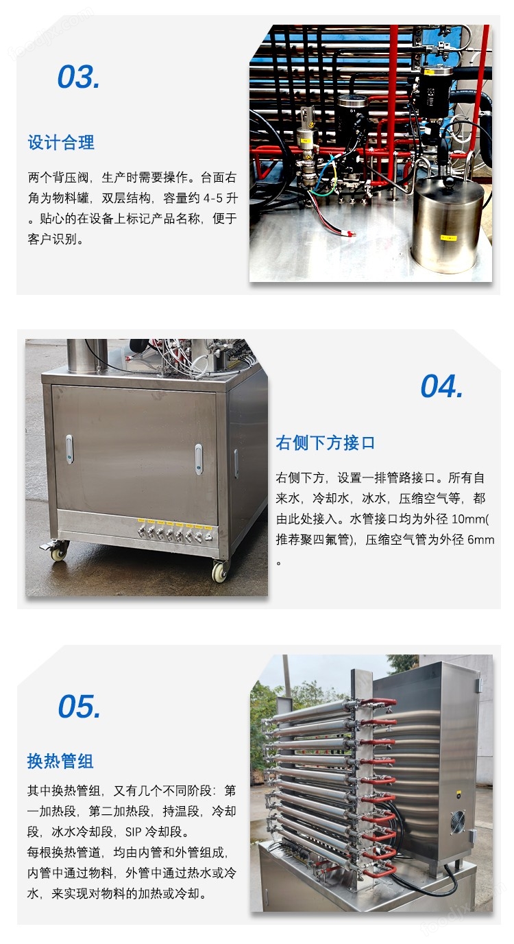 具體過程: 1. 物料從料罐內(nèi)被泵送出來,在 1、2 段加熱至殺菌溫度; 2. 再經(jīng)過持溫段,通過維持一段時長高溫,來達(dá)到滅菌效果; 7 / 18設(shè)備使用維護(hù)說明書 3. 之后進(jìn)入冷卻段和冰冷段,物料被冷卻至所需溫度,之后出料 至充填室。 全部加溫、持溫、冷卻的過程,都在管道內(nèi),由物料泵推動,在 流動過程中完成,整個過程連續(xù)進(jìn)行。 更詳細(xì)的工藝說明,請參考設(shè)備工藝圖。 注意:不同的持溫要求(5S,15S 等),需要連接不同的持溫管 道。