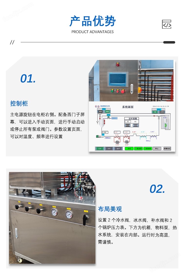 自動背壓殺菌機(jī)產(chǎn)品簡介自動背壓殺菌機(jī)(又稱 UHT 超高溫滅菌設(shè)備)是一款專為液體及罐裝食品打造的高效滅菌設(shè)備,采用蒸汽加熱與壓縮空氣反壓結(jié)合的核心技術(shù),通過精準(zhǔn)控溫、控壓及持溫時間,實(shí)現(xiàn)微生物的滅活。設(shè)備適配范圍廣泛,可滿足牛奶、果汁、豆奶、醬料、湯品等多種熱敏性及低酸食品的滅菌需求,在殺滅有害微生物的同時,保留產(chǎn)品原有風(fēng)味、色澤與營養(yǎng)價值。其采用食品級不銹鋼管路及聚四氟適配組件,搭配氣動閥門控制與螺桿泵輸送系統(tǒng),確保生產(chǎn)過程的衛(wèi)生安全與穩(wěn)定連續(xù)。整機(jī)具備全自動化運(yùn)行能力,搭載智能 PLC 控制系統(tǒng)與觸控操作界面,支持殺菌溫度、壓力、持溫時間等參數(shù)的靈活設(shè)定,配合自動 CIP 清洗、SIP 在線消毒功能,大幅降低人工干預(yù)與操作難度。同時內(nèi)置壓力過高報警、溫度異常斷電等多重安全保護(hù),兼具節(jié)能環(huán)保設(shè)計,在提升生產(chǎn)效率與產(chǎn)品保質(zhì)期的同時,有效控制能耗與水耗,是食品飲料加工行業(yè)實(shí)現(xiàn)規(guī)?;?、標(biāo)準(zhǔn)化生產(chǎn)的核心設(shè)備。