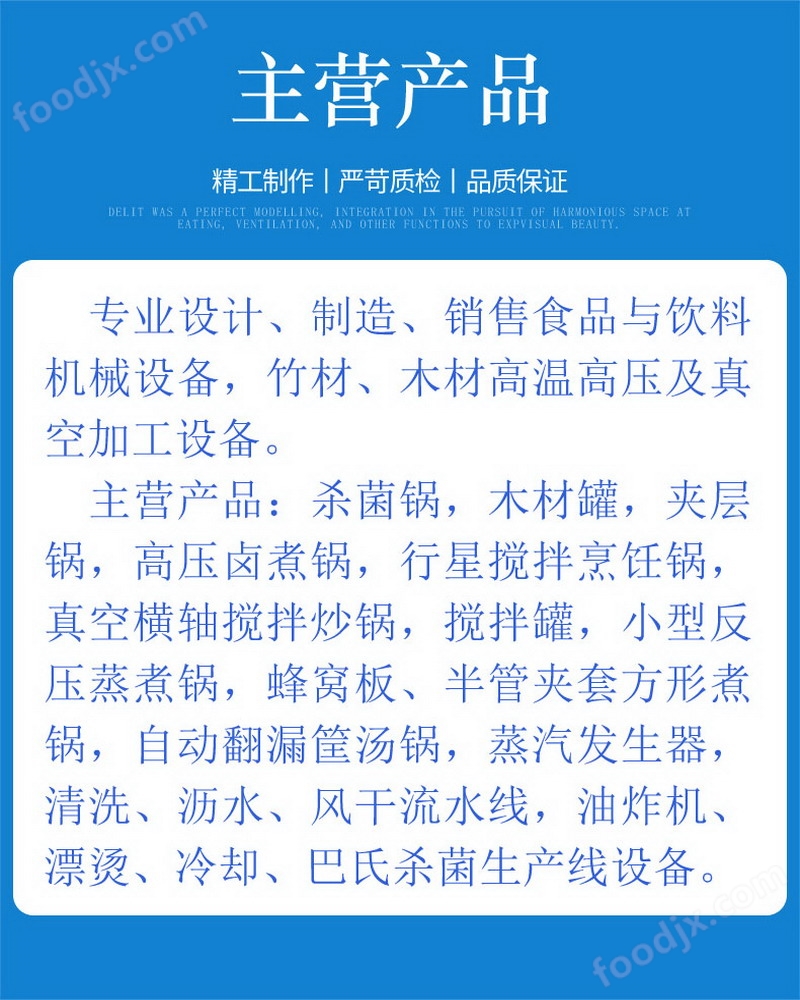 殺菌鍋,木材罐,夾層鍋,高壓鹵煮鍋,行星攪拌炒鍋,真空橫軸攪拌炒鍋,真空包裝機(jī),攪拌罐,小型反壓蒸煮鍋,蜂窩夾套聯(lián)體方鍋,自動(dòng)翻筐鍋,蒸汽發(fā)生器,清洗瀝水風(fēng)干線,油炸機(jī),巴氏殺菌線設(shè)備